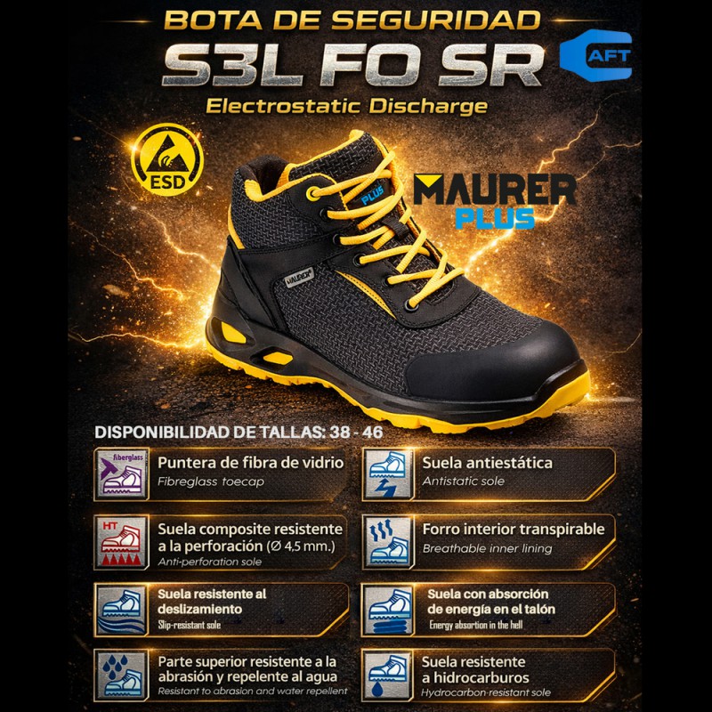 Bota Seguridad Maurer S3 Antideslizante con Suela Composite y Resistencia a los Hidrocarburos.