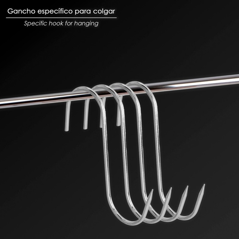- Forma "S" con punta puntiaguda para facilitar el clavado en productos cárnicos.