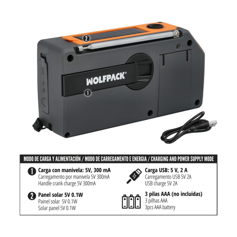 - Carga con manivela: 5 V, 300 mA